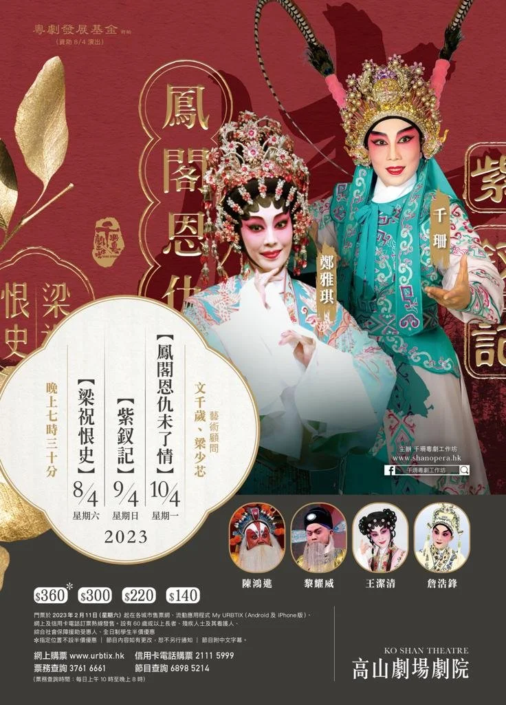 Upcoming performances Apr 8 to Apr 10 THE BUTTERFLY LOVERS/ ROMANCE OF THE PHOENIX TOWER/ THE LEGEND OF PURPLE HAIRPIN Sat, Apr 8, 2023 7:30 PM Mon, Apr 10, 2023 11:00 PM KO SHAN THEATRE (map) Google Calendar ICS View Event → Oct 8 to Oct 9 THE REINCARNATION OF THE RED PLUM & PRAYING TO THE MOON Sat, Oct 8, 2022 7:30 PM Sun, Oct 9, 2022 11:00 PM KO SHAN THEATRE (map) Google Calendar ICS View Event → May 30 to May 31 LEGEND OF GODDESS LUO / THE PITILESS SWORD Mon, May 30, 2022 7:30 PM Tue, May 31, 2022 11:00 PM KO SHAN THEATRE (map) Google Calendar ICS View Event → Feb 8 to Aug 9 THE PEACH BLOSSOM FAN / LEGEND OF THE WHITE SNAKE Tue, Feb 8, 2022 7:30 PM Tue, Aug 9, 2022 11:00 PM WEST KOWLOON XIQU CENTRE (map) Google Calendar ICS View Event → Aug 25 THE BUTTERFLY LOVERS CHARITY PERFORMANCE Wednesday, August 25, 2021 7:30 PM 11:00 PM SUN BEAM THEATRE (map) Google Calendar ICS View Event → Apr 30 to May 1 PRINCESS CHANG PING / THE RETURNED ARMOUR Fri, Apr 30, 2021 7:30 PM Sat, May 1, 2021 11:00 PM KO SHAN THEATRE (map) Google Calendar ICS View Event → Oct 13 The Dream of Red Mansion Tuesday, October 13, 2020 7:30 PM 10:30 PM West Kowloon Cultural District Xiqu Centre (map) Google Calendar ICS View Event → Sep 13 Drums along the Battlefield Sunday, September 13, 2020 7:30 PM 10:30 PM Ko Shan Theatre New Wing (map) Google Calendar ICS View Event → Jan 23 The Legend of Xishi Thursday, January 23, 2020 7:30 PM 10:30 PM Ko Shan Theatre New Wing (map) Google Calendar ICS View Event → Dec 21 Dream of the Peony Pavilion Saturday, December 21, 2019 7:30 PM 10:30 PM Xiqu Centre (map) Google Calendar ICS View Event →